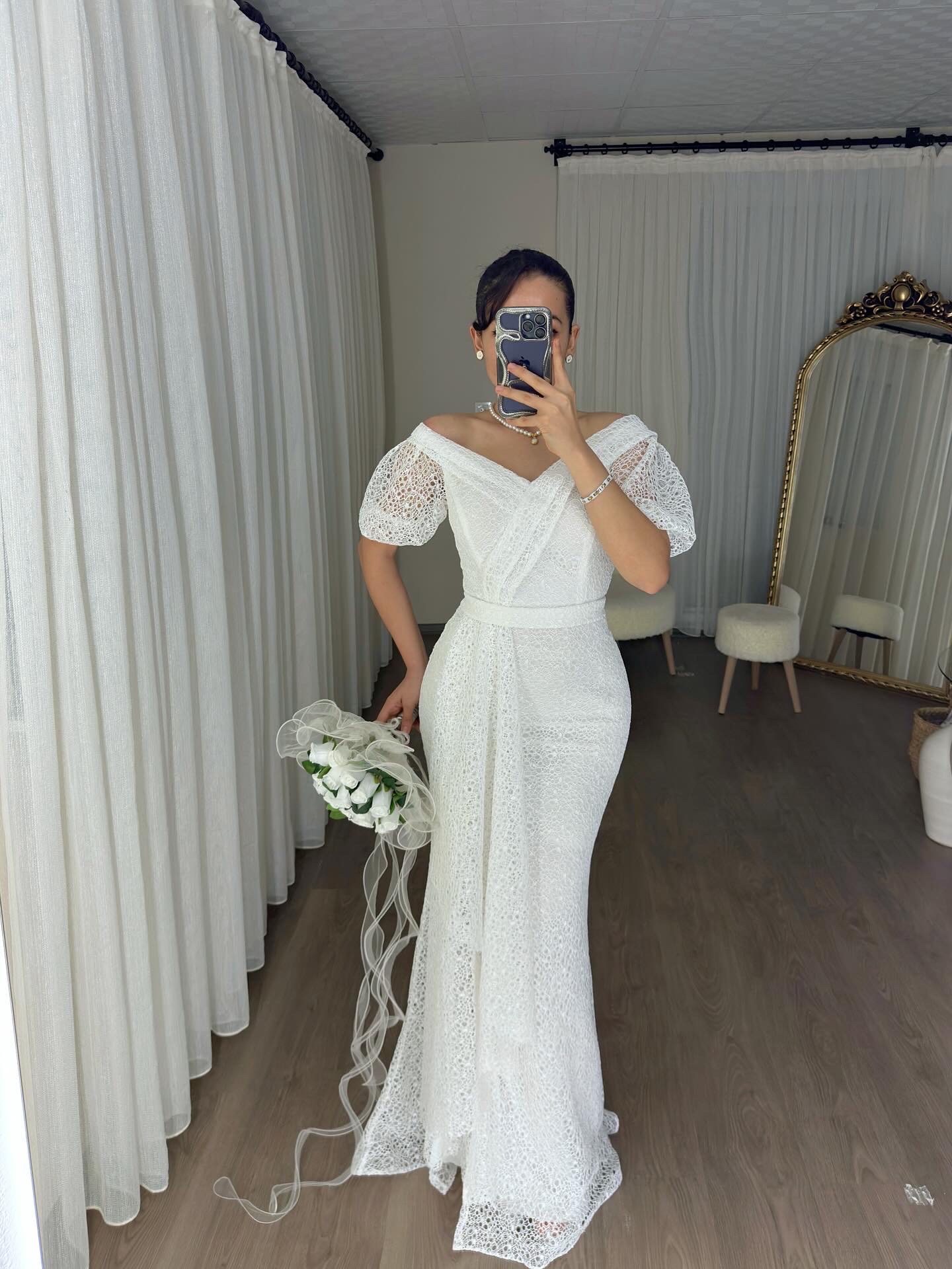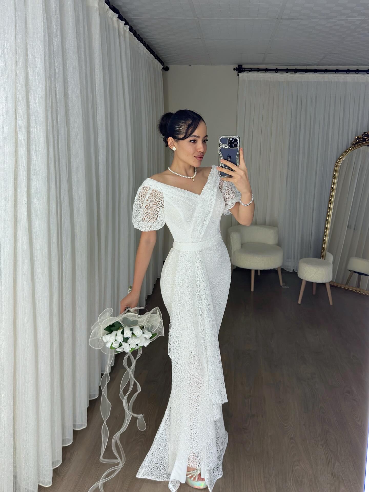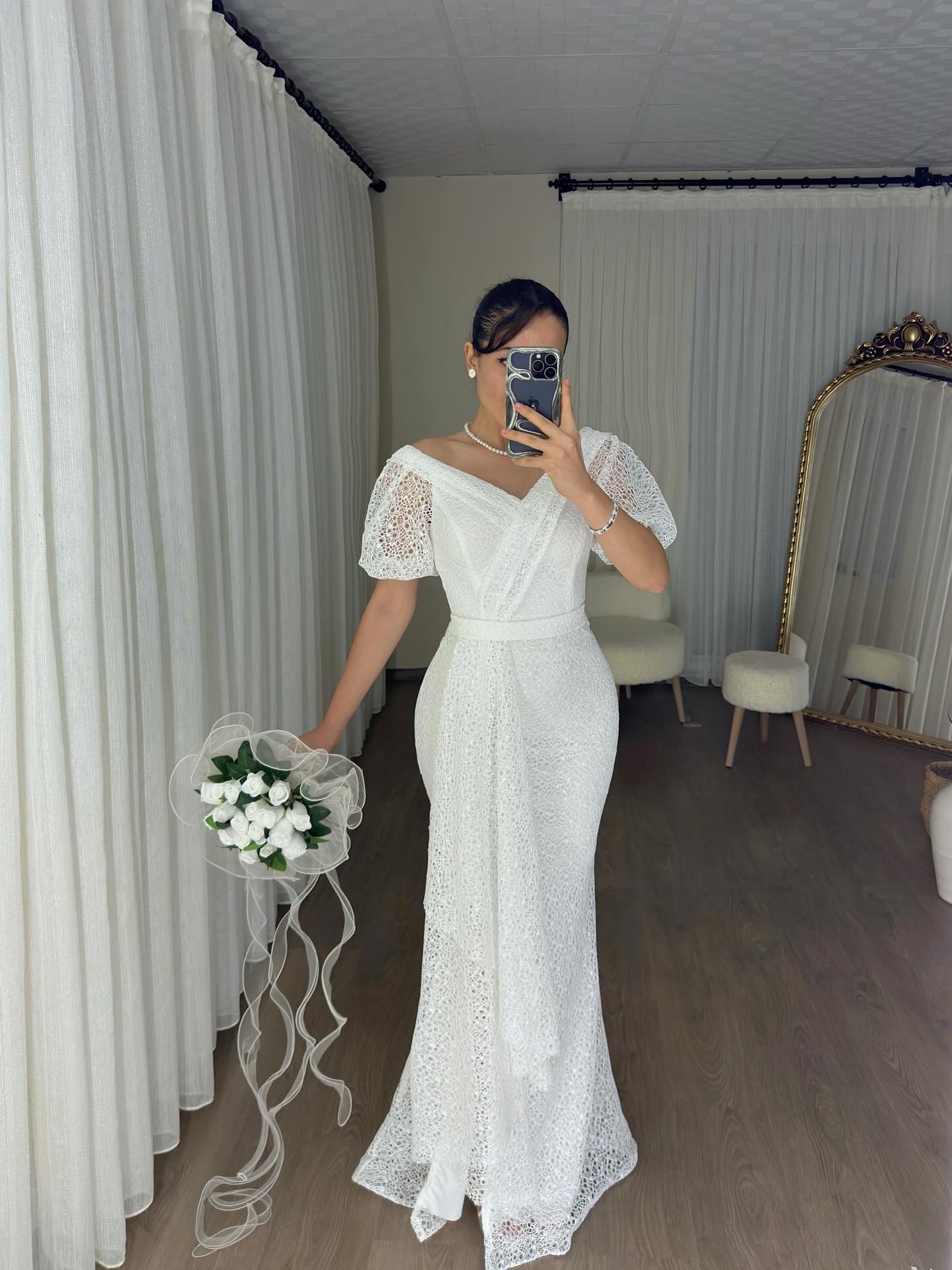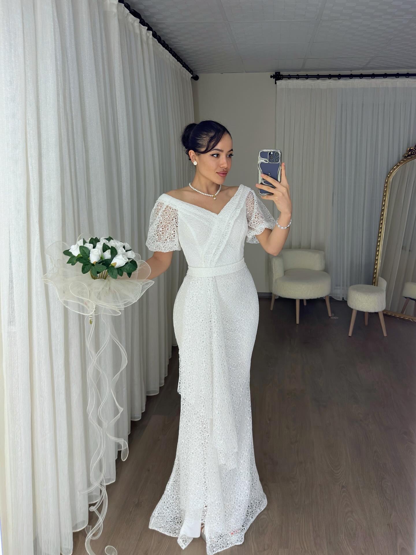 BEYAZ GÜPÜRLÜ BALIK ABİYE ELBİSE