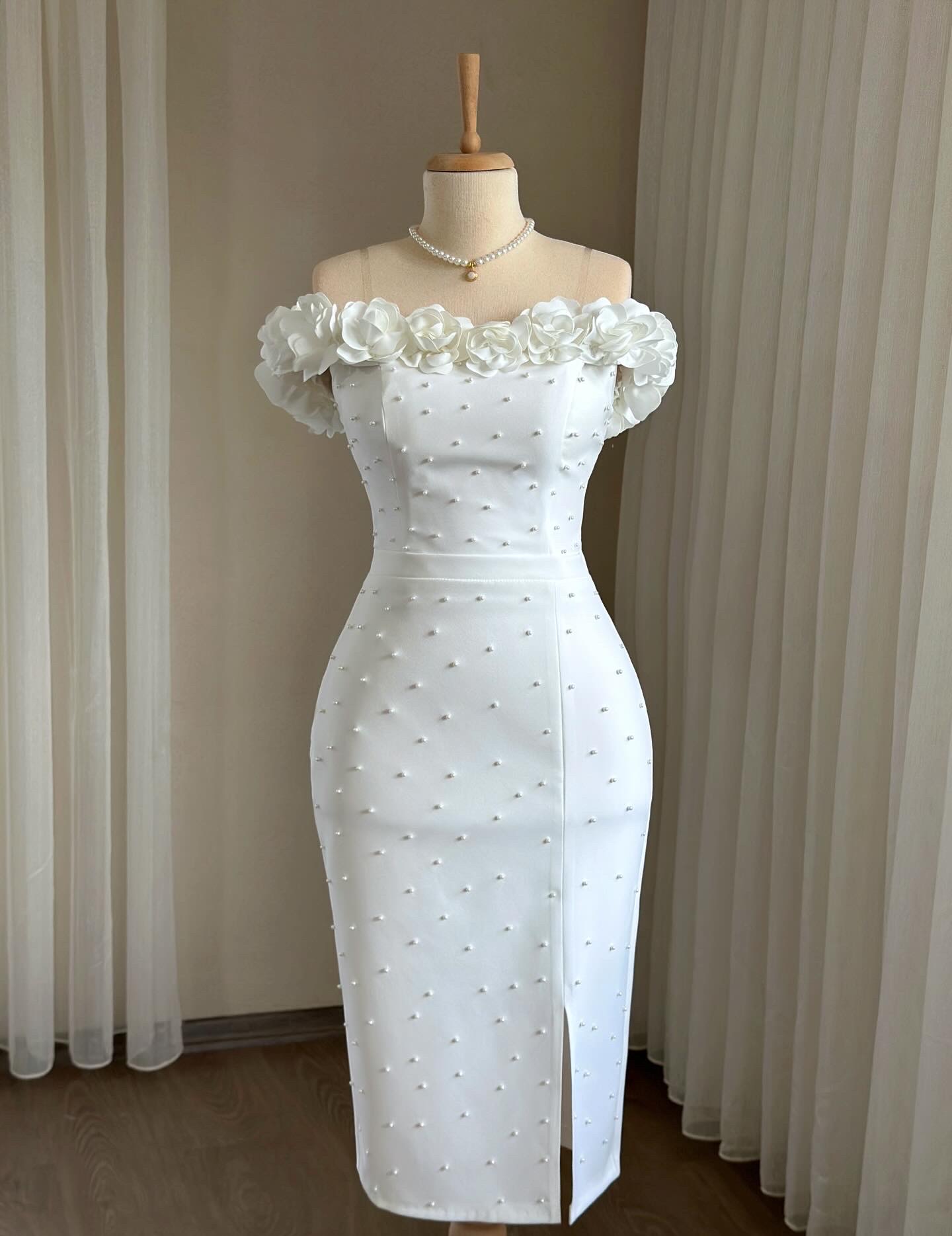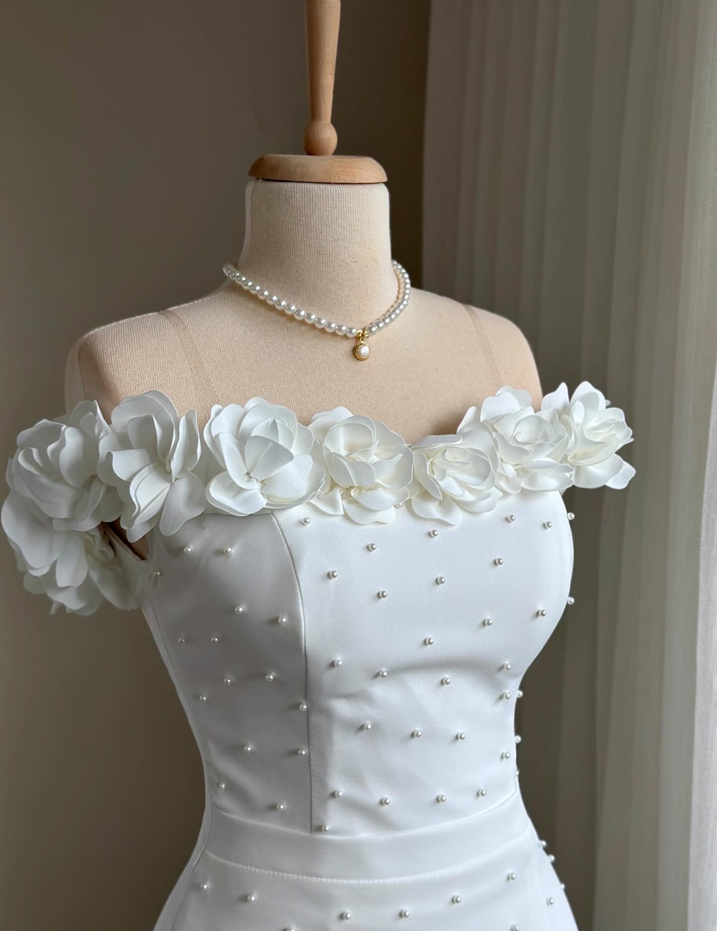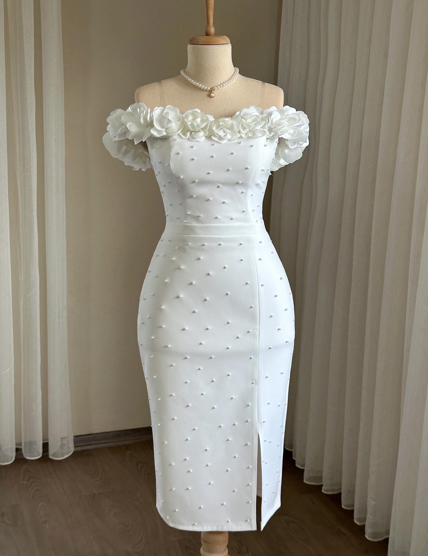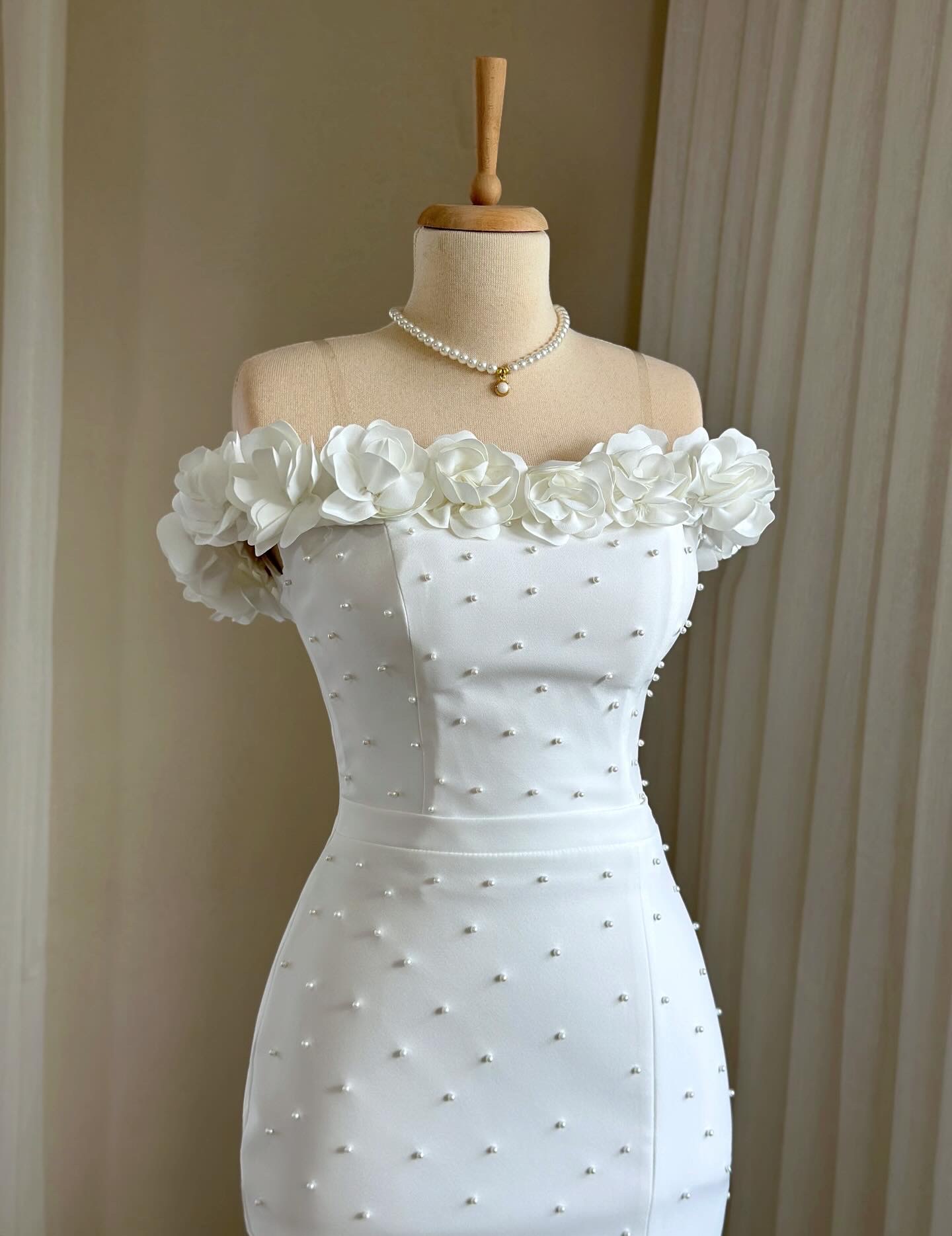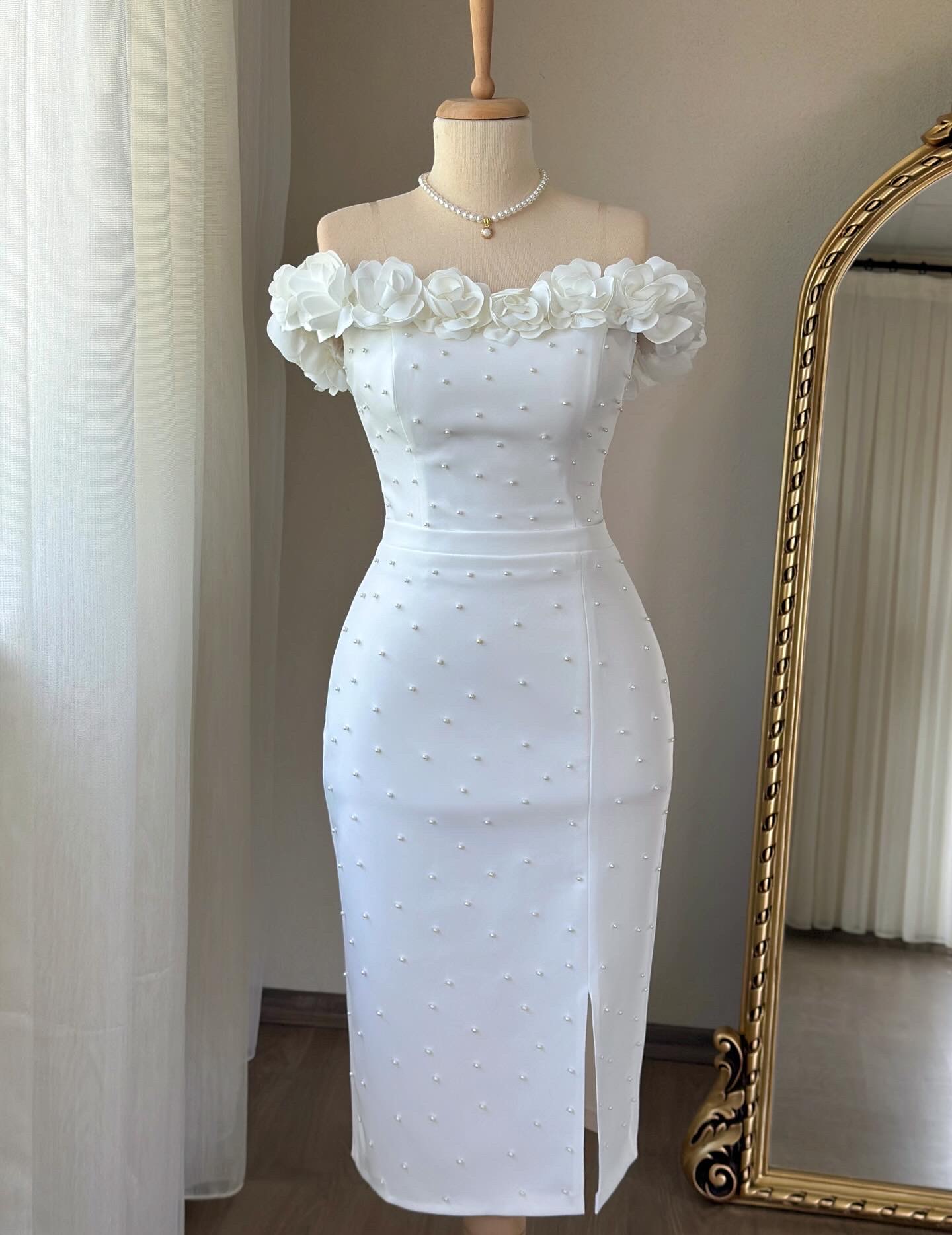 BEYAZ İNCİLİ ÇİÇEK DETAYLI TASARIM ABİYE ELBİSE
