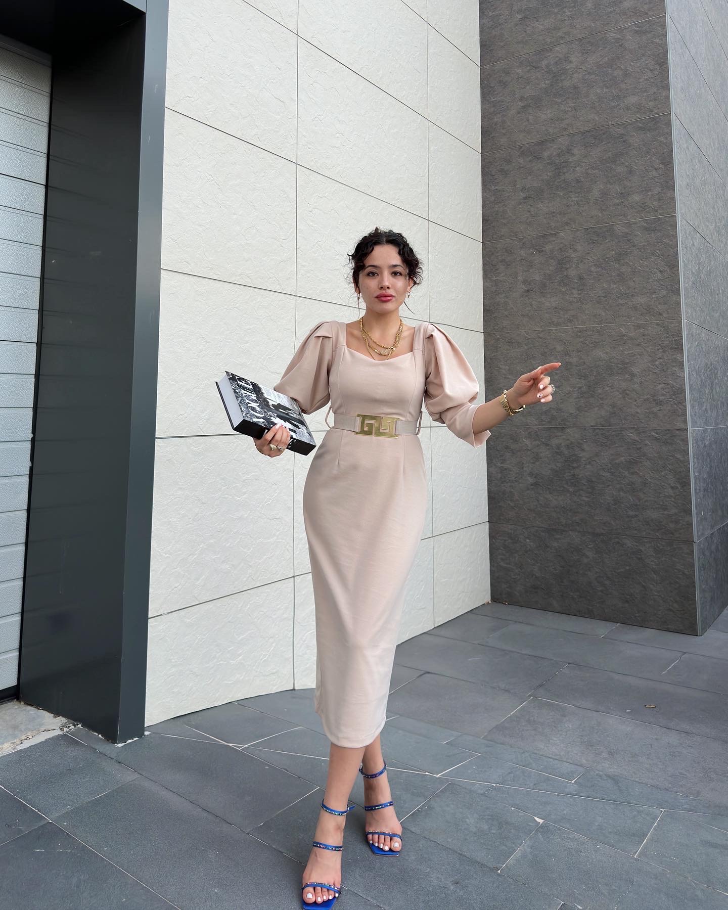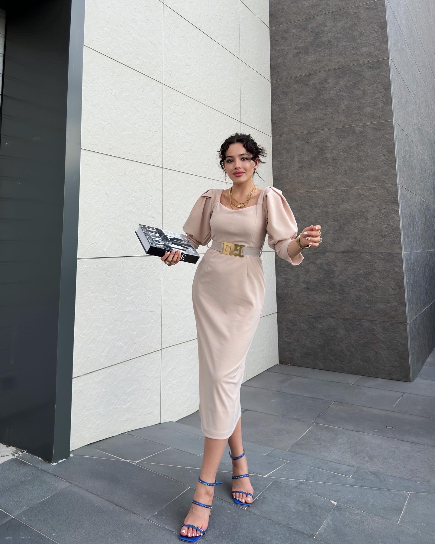 KREM DESEN KEMERLİ KREP KUMAŞ ELBİSE