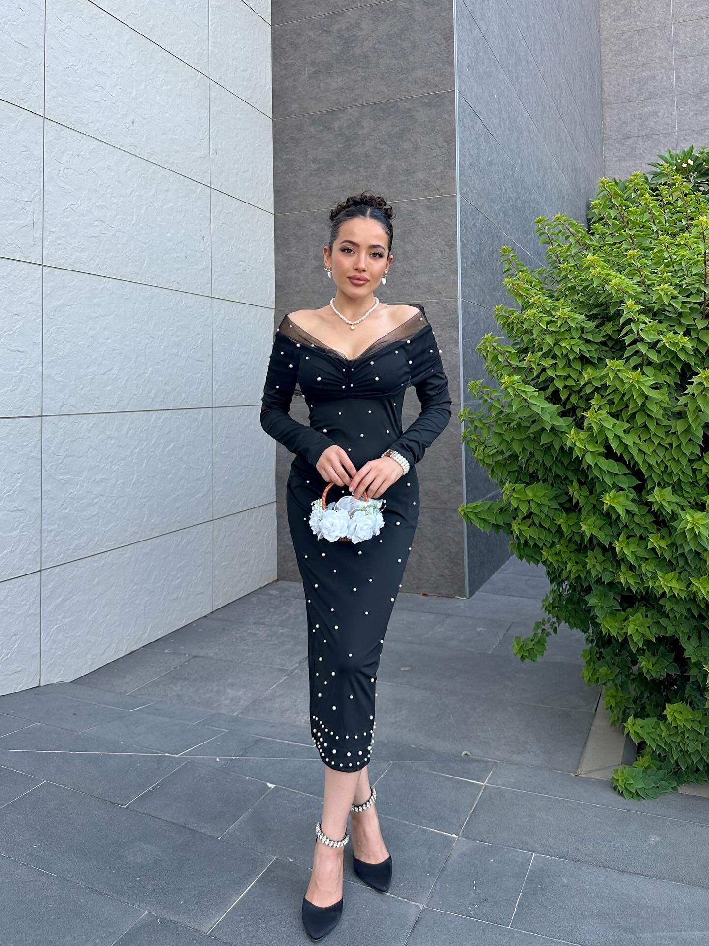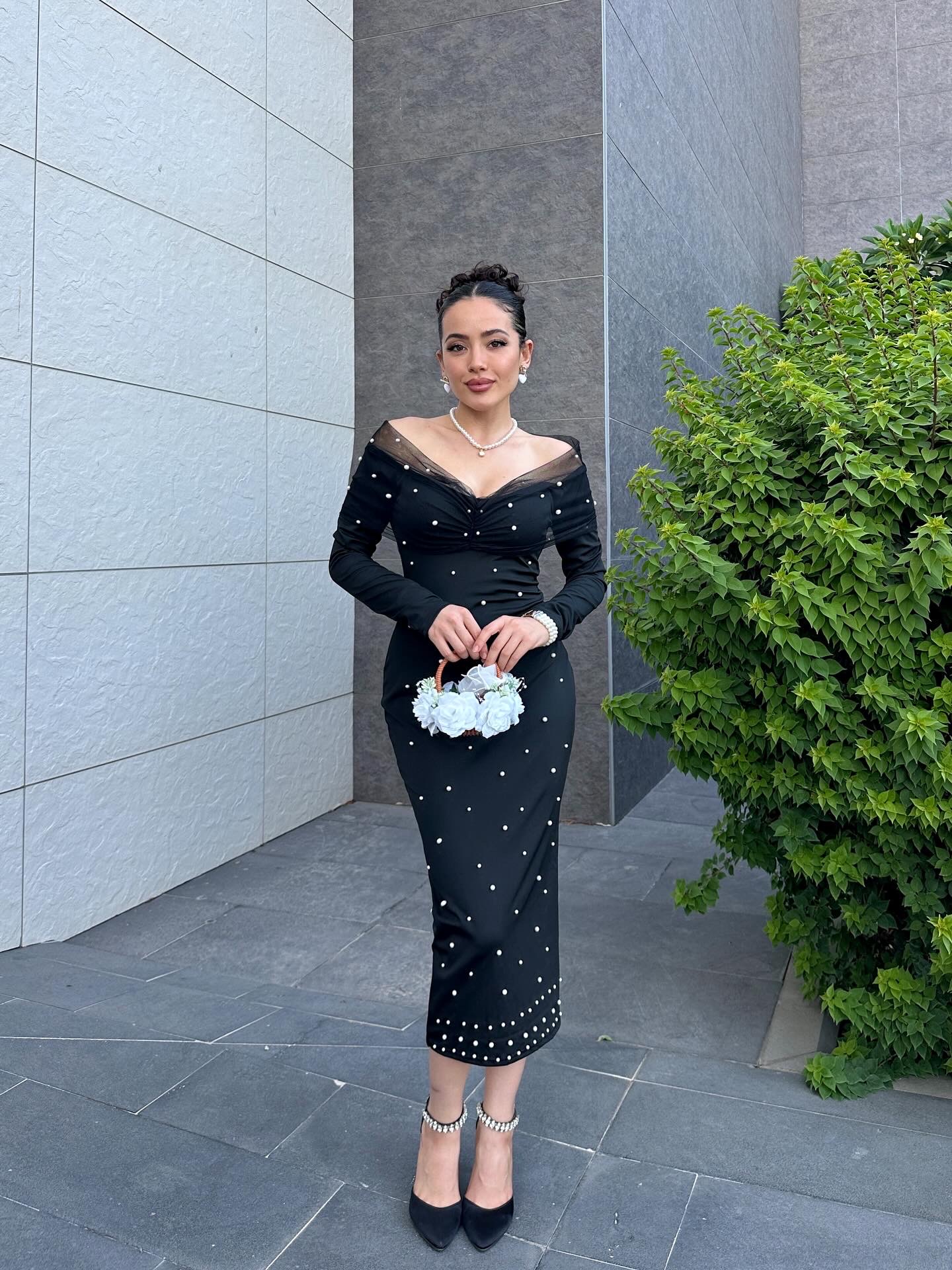 SİYAH İNCİLİ TÜL DETAYLI ELBİSE