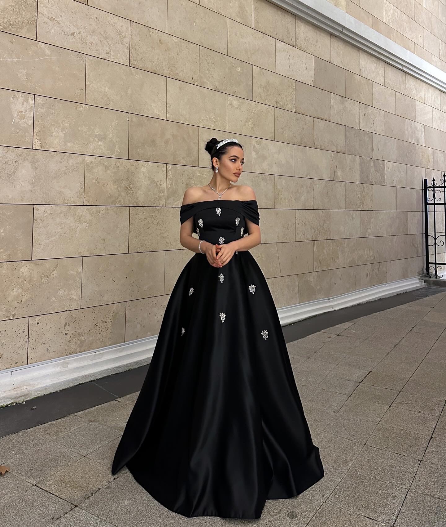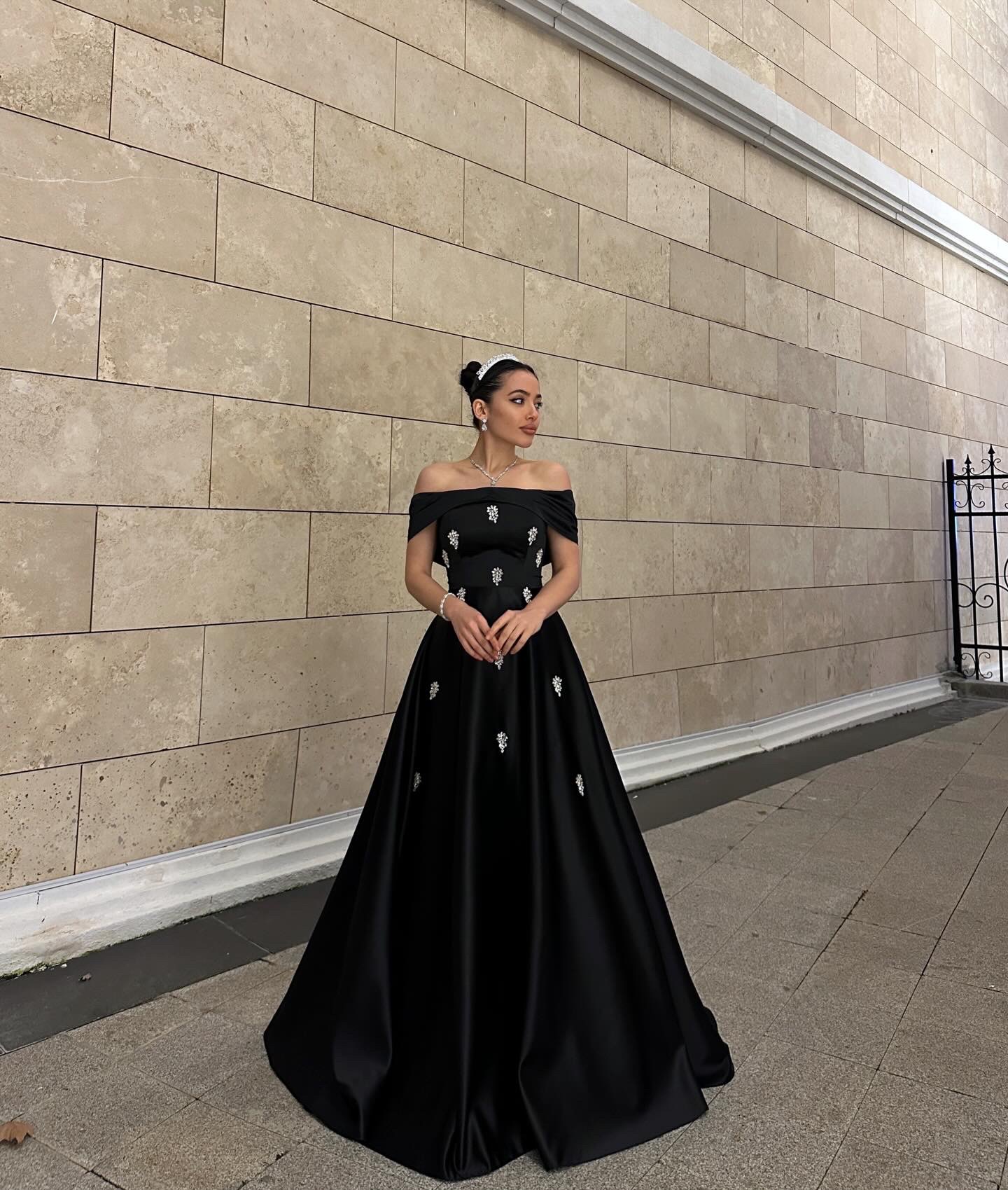 SİYAH SATEN TAŞ DETAYLI MALEFİZ ABİYE