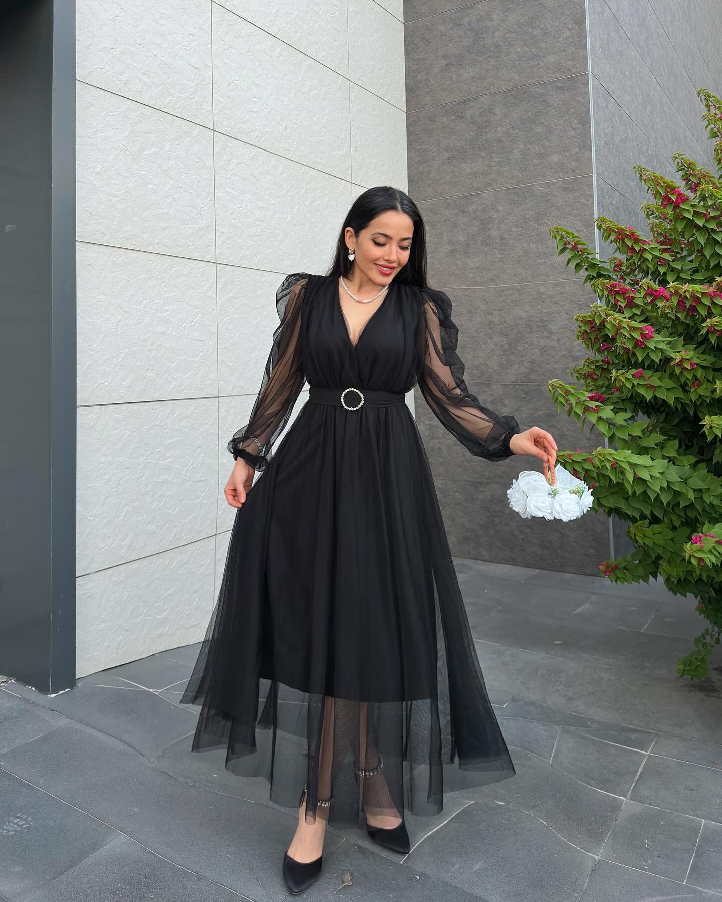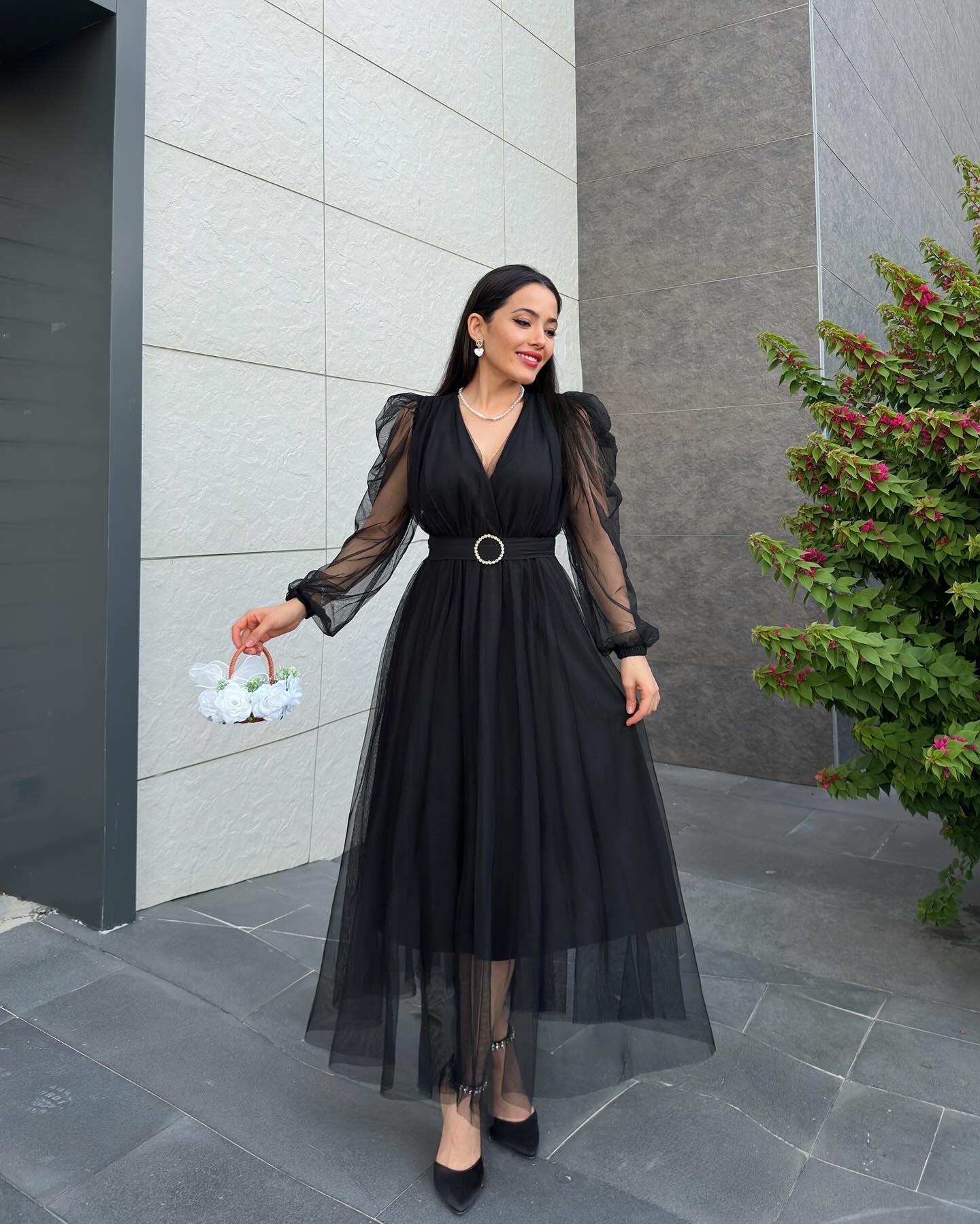 SİYAH TÜLLÜ BEL DETAYLI ELBİSE