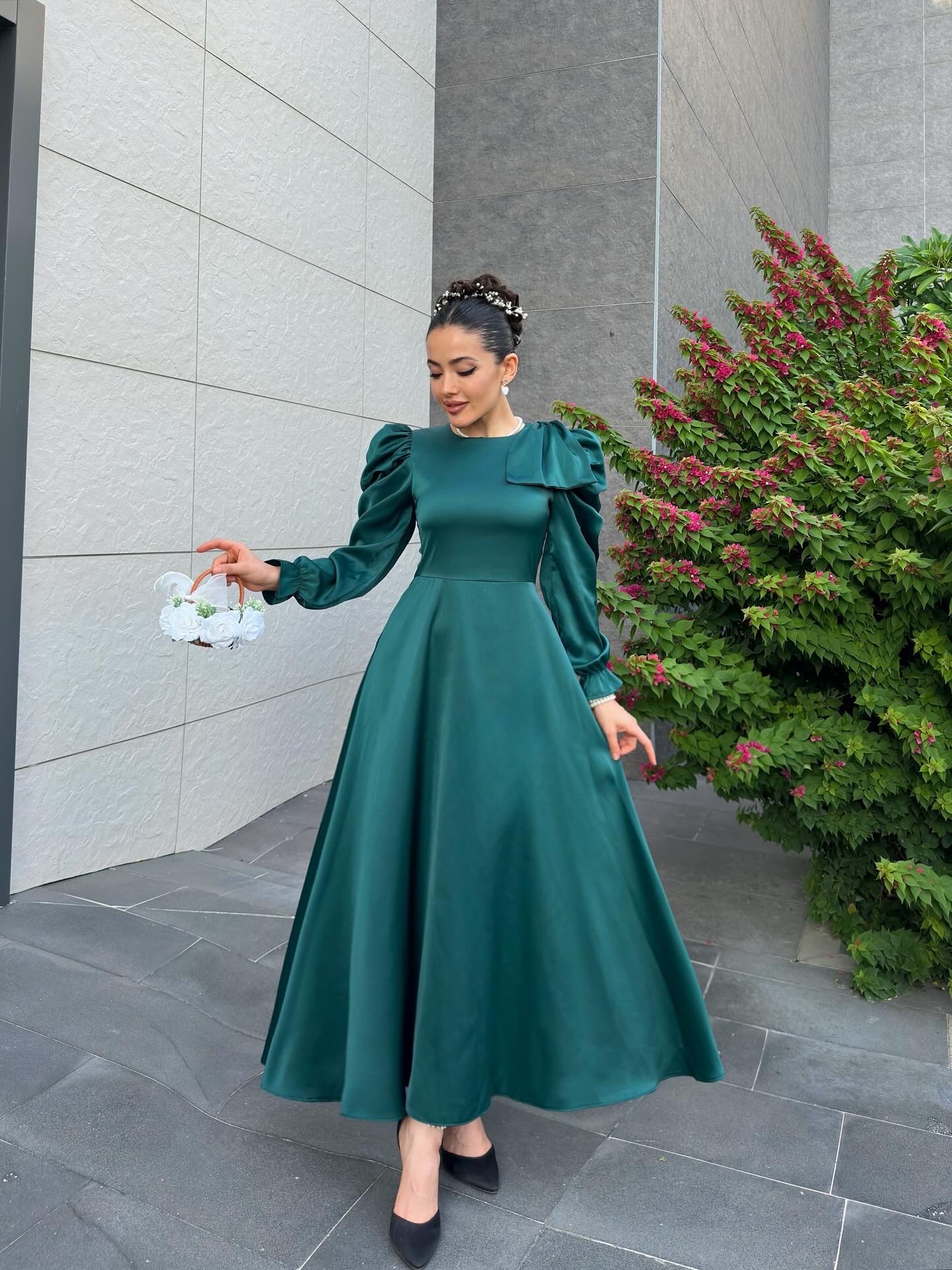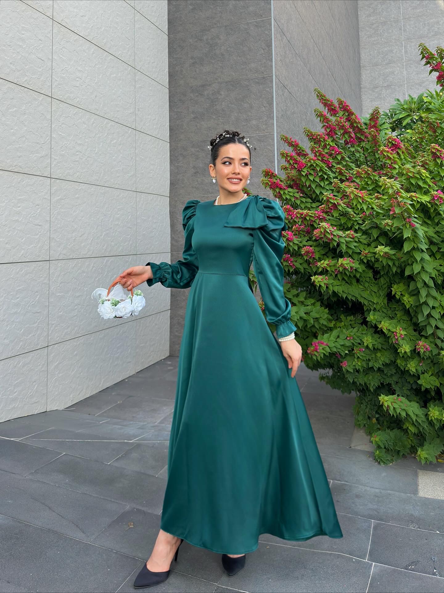 ZÜMRÜT YEŞİLİ SATEN FİYONK DETAYLI ABİYE ELBİSE