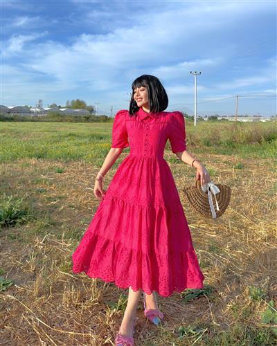 KIRMIZI BÜZGÜLÜ FIRFIRLI ELBİSE