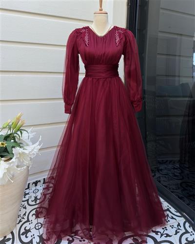 BORDO TÜL İŞLEME DETAYLI ABİYE ELBİSE