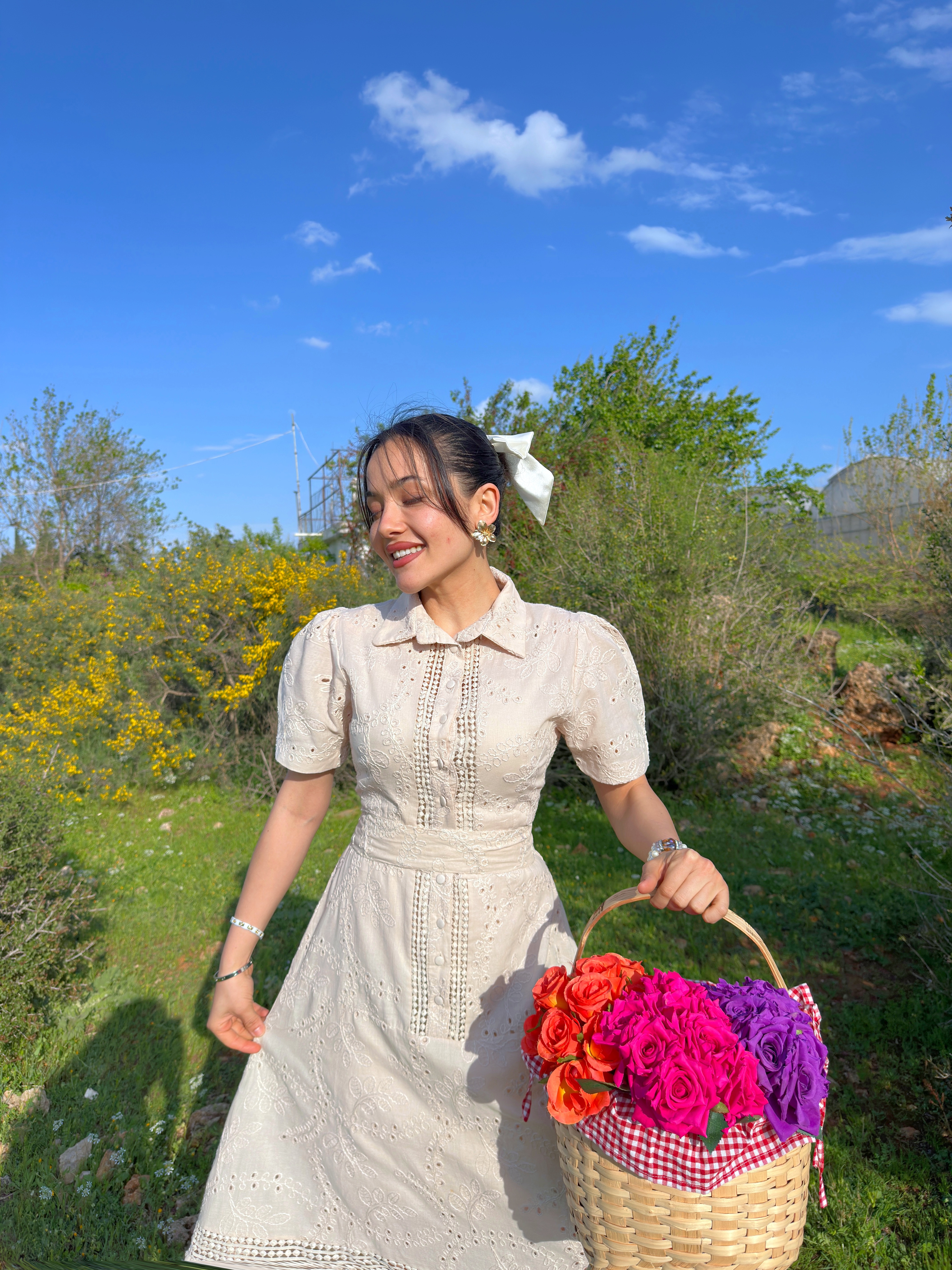 BEJ %100 PAMUKLU FİSTO KABARTMALI ELBİSE