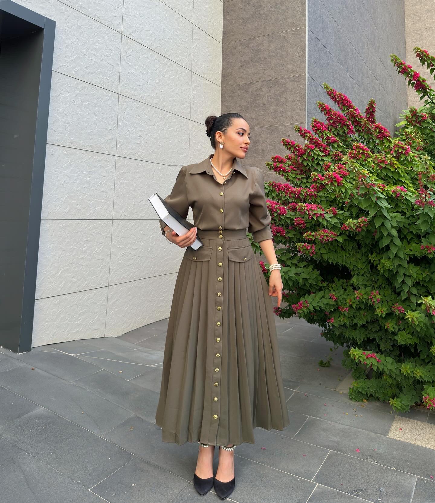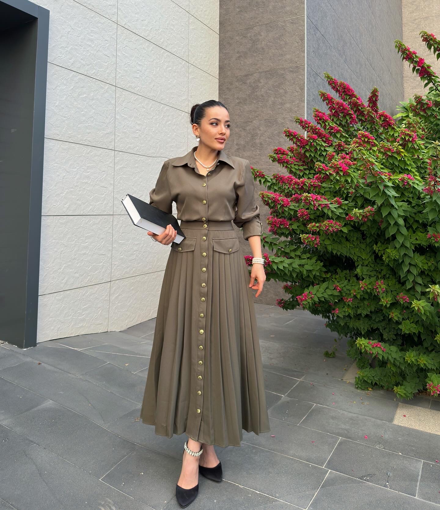 DÜĞME DETAYLI PİLİSELİ ELBİSE