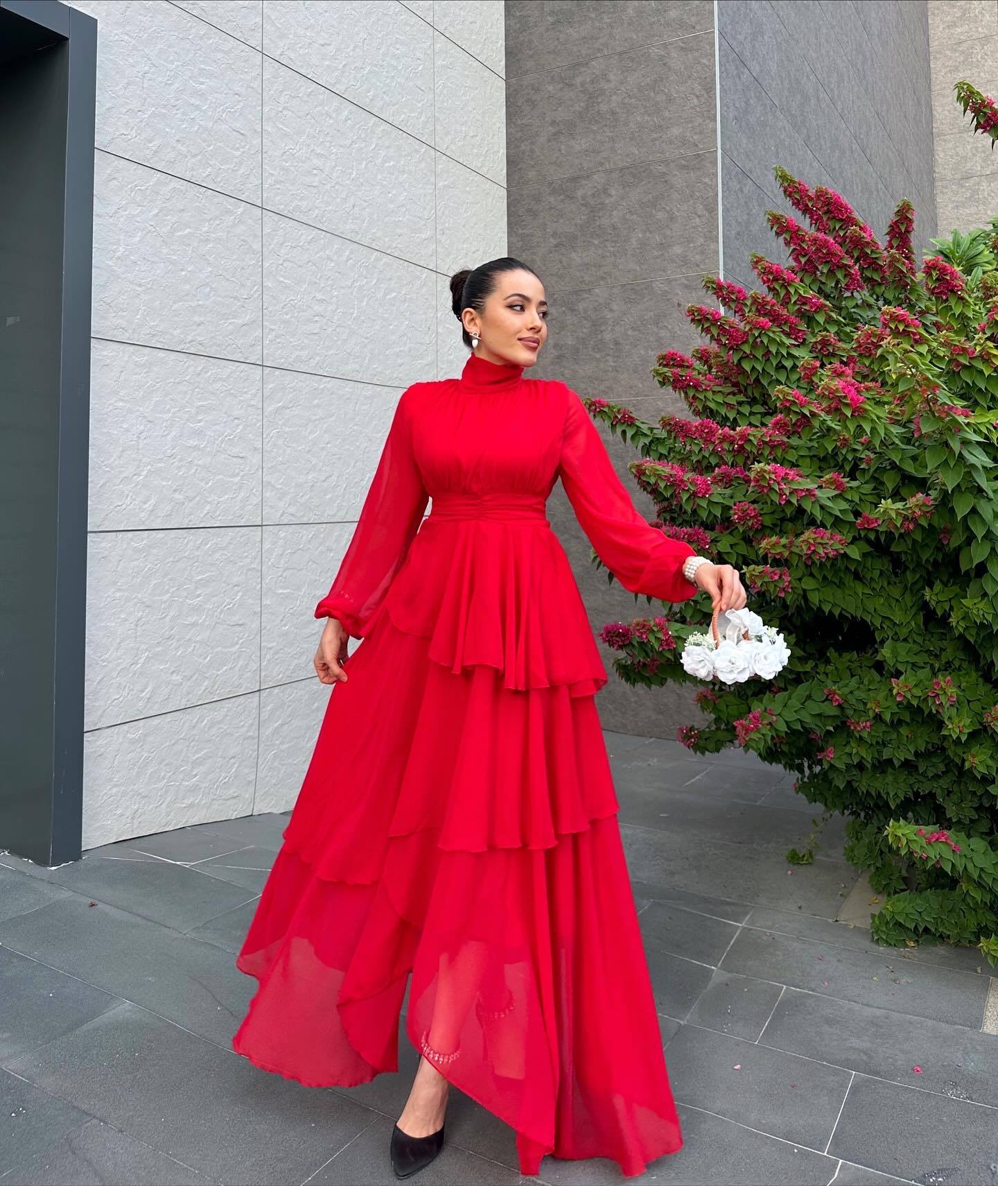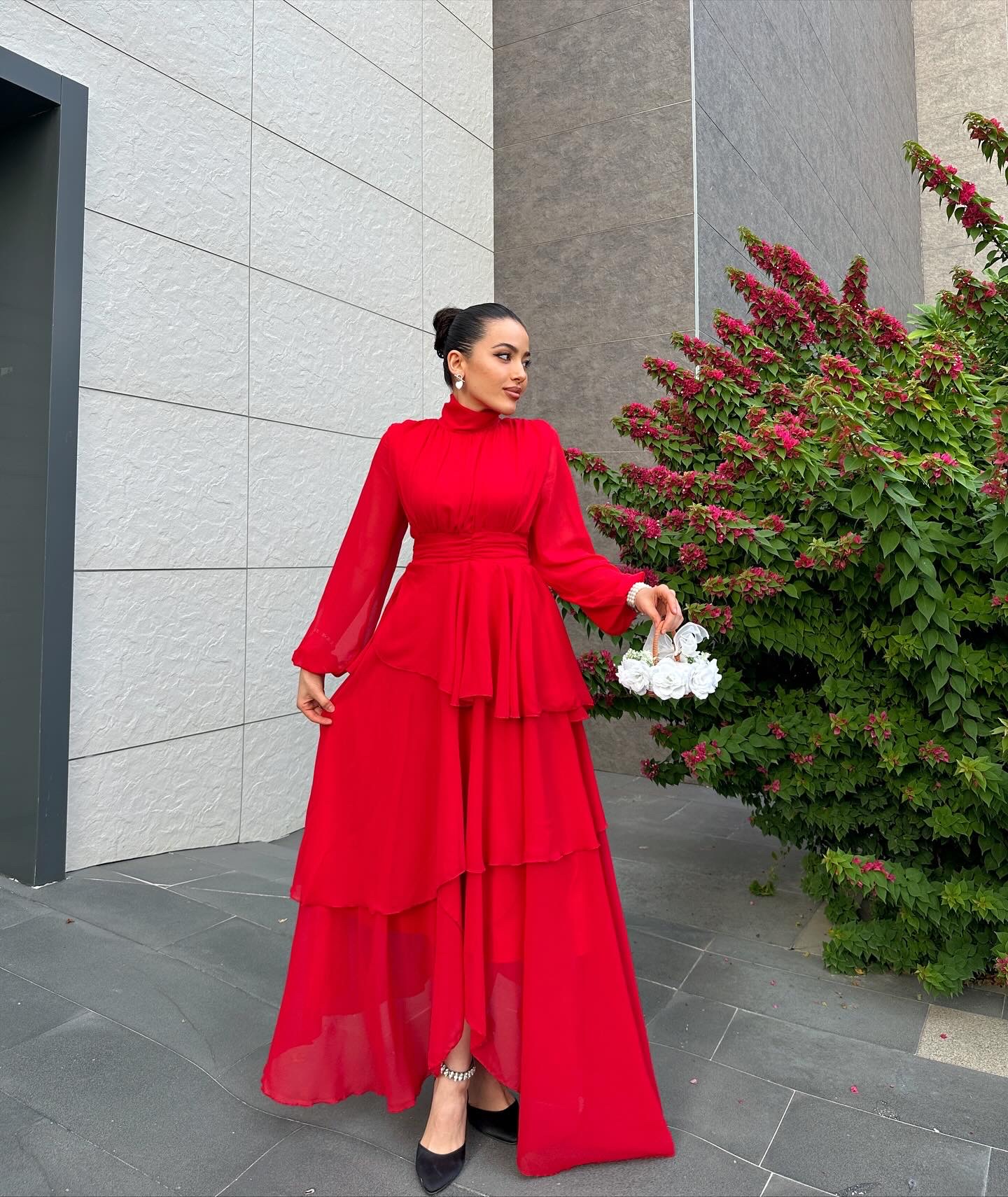 KIRMIZI ŞİFON KATLI ELBİSE