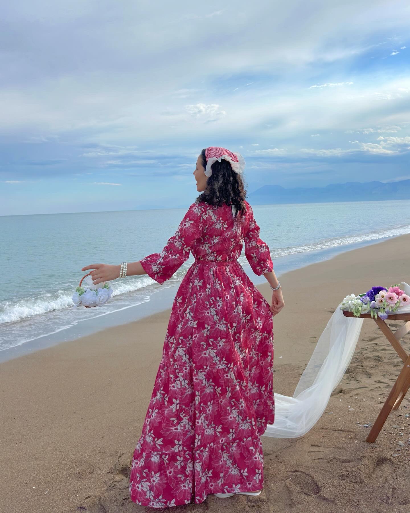 PEMBE KUŞAKLI ÇİÇEKLİ MAXİ BOY ELBİSE