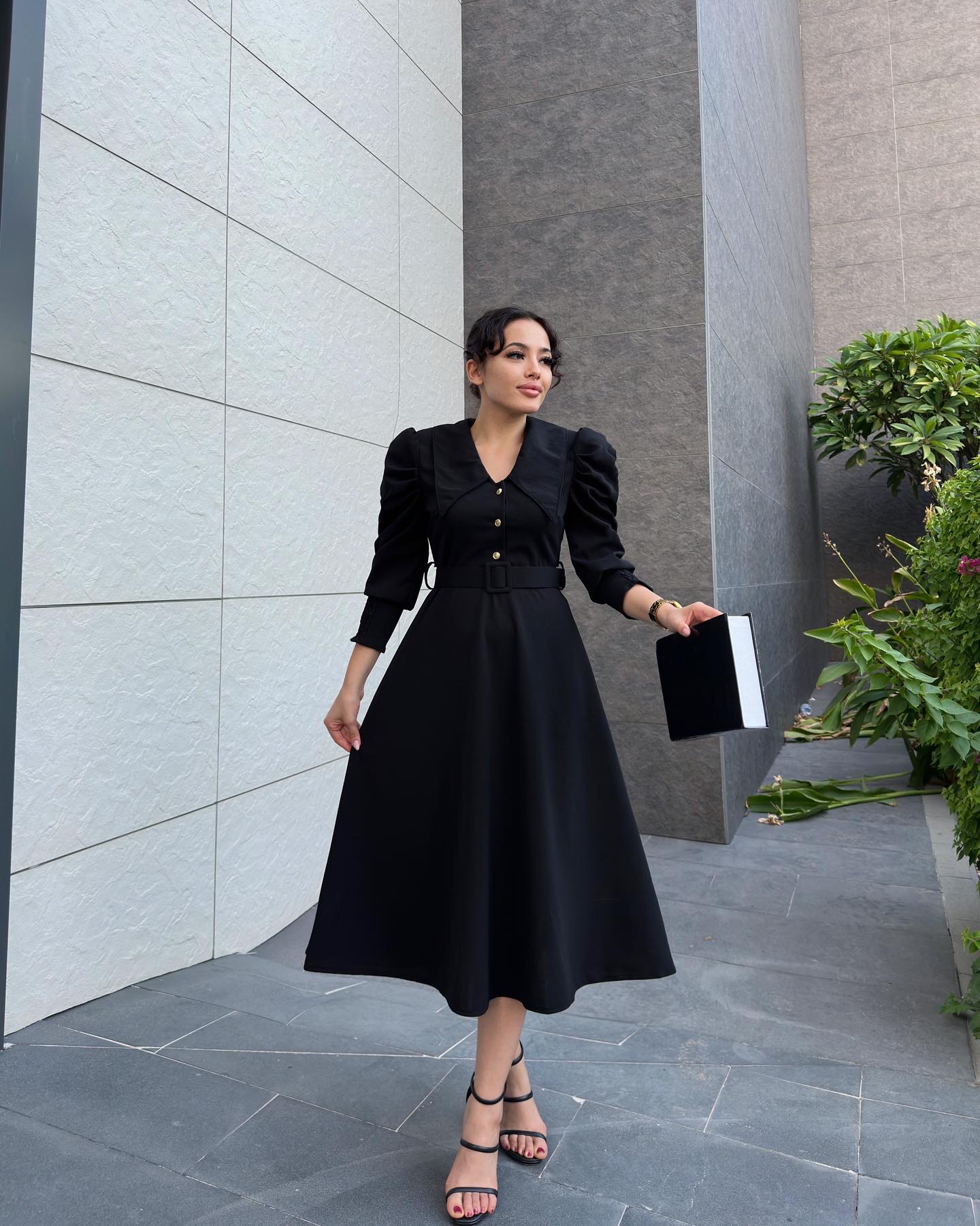 Siyah Yaka Detaylı Düğmeli Elbise