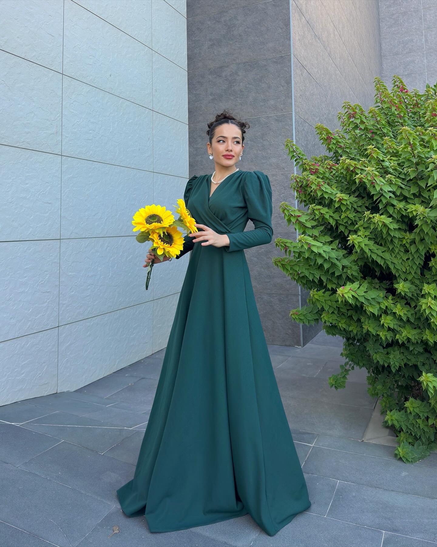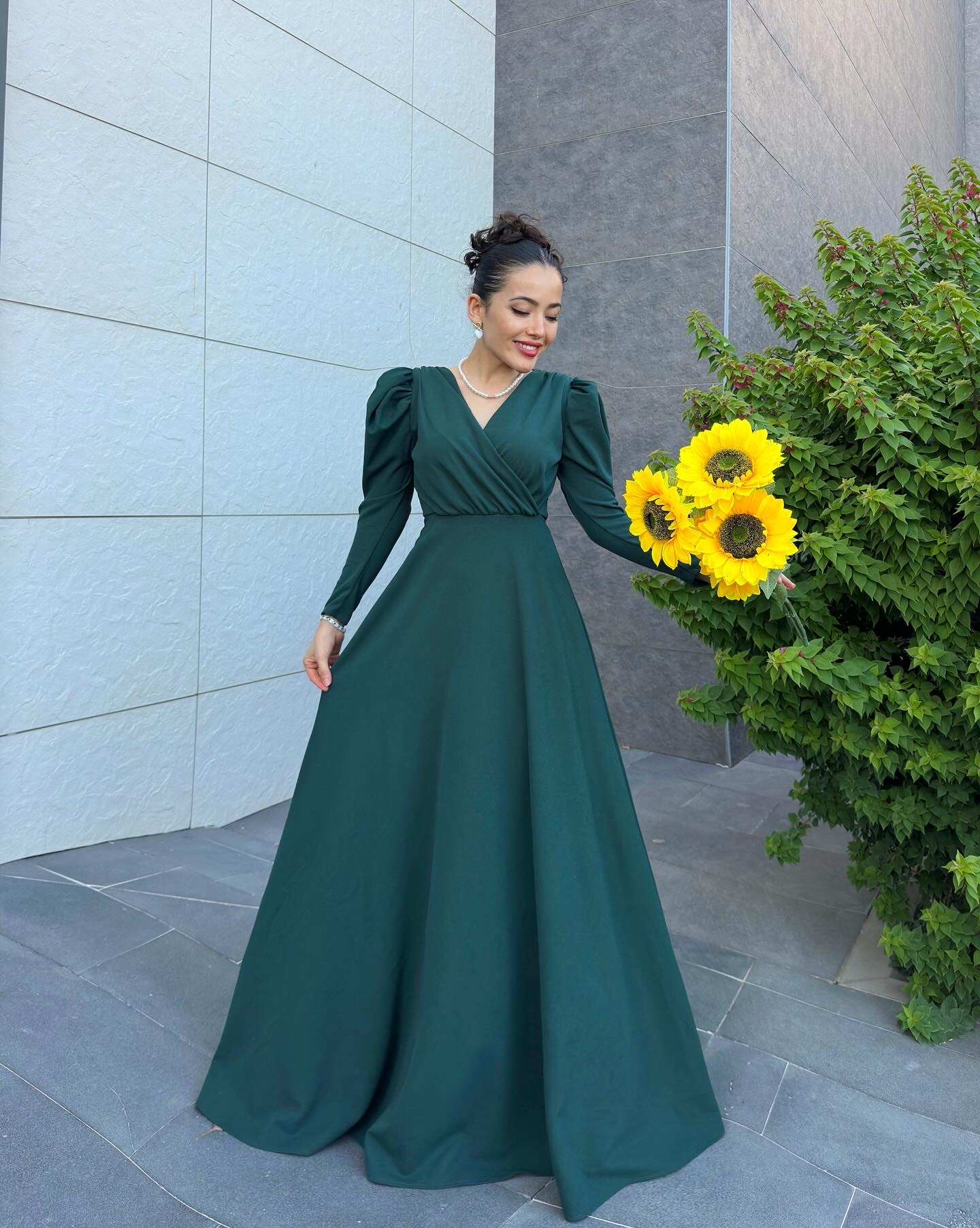 ZÜMRÜT YEŞİLİ KREP UZUN ABİYE ELBİSE